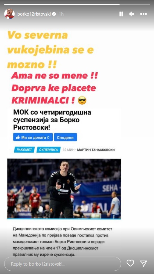„Во северна вукојeбина се е можно ама не со мене. Допрва ќе плачете криминалци“. Ваква порака објави голманот Борко Ристовски на неговиот профил на „Инстаграм“ по суспензијата во времетраење од четири години.